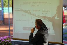 Pünktlich um 09.09 Uhr begann im Clubhaus des Tennisclubs Landquart der spannende Vortrag von Andri Bischoff, dem früheren Leiter der kantonalen Fachstelle Wasserbau. Anhand ausgewählter Folien aus alten Dokumenten, Schemata zu Uferaufbau und alter Flussführung hat er uns die geschichtlichen Hintergründe der Wuhrung der Landquart erläutert.
